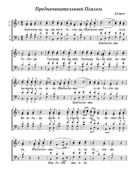 Подобно тому, как икона Пресвятой Троицы преподобного Андрея Рублева была зарисована несколько раз в угоду модным для своего времени живописным веяниям и темными провалами ликов чернела из-под металлических «риз», и только усилиями реставраторов предстала перед нами в своей первозданной чистоте и святости, так и древний распев Предначинательного псалма проходит множество гармонизаций разных композиторов, прежде чем мы услышим его таким, каков он есть — одноголосным (пример 1) или возрожденном в творчестве композиторов конца XIX века.