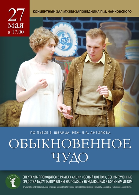В рамках акции "Белый цветок" в ТРЦ «Счастливая 7я» будут организованы ярмарка и детский праздник (с 13.30 до 15.00). Вечером этого же дня (в 17.00) в концертном зале музея-заповедника П.И. Чайковского состоится спектакль «Обыкновенное чудо» по одноименной пьесе Е. Шварца, подготовленный театральной студией Скорбященского храма г. Клина (режиссер Л.А. Антипова).