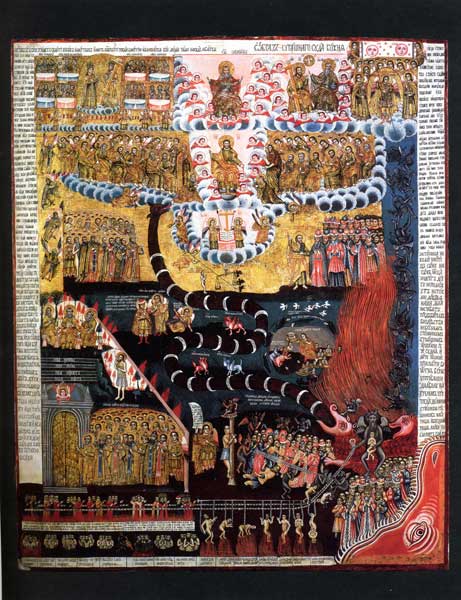 На Афоне в трапезе Лавры св.Афанасия на входной стене, у самого входа над дверьми и по обе стороны – сложное изображение Страшного Суда, представленное в виде ряда отдельных сцен, снабженных длинными греческими надписями уставного письма. Вверху представлен Христос Вседержитель, в кругу, на херувимах и серафимах; по сторонам Его стоящие Предтеча и Богоматерь, 12 апостолов на своих торжественных седалищах. По арке над дверью четыре ангела, по обе стороны арки группы людей, обращающиеся к Судии со словами признания, по Евангелию, на тему: «когда мы видели Тебя алчущим и прочее». По обе стороны входа ясно представлены сцены праведных, воскресших для вечной жизни, и грешников, воскресших для вечных мук. Первое царство изображено справа от входа. Здесь уготованный престол – кресло резное, с крестом, копием, тростью, Евангелием на покрытой подушке; по сторонам павшие на колена Адам и Ева как образ всего преклонившегося праведного, искупленного человечества. Ниже на это видение ангел указывает лежащему и проснувшемуся Даниилу. Во гробе подымаются с мольбой к Богу воскресшие. На левой стороне две группы воскресших, группа ангелов и несколько демонов, спорящих за жертвы перед весами (весы правосудия). Огненная река течет, расширяясь, и в нее ангел погружает вынырнувшего грешника. Боковые стены представляют рай и ад и дополнительные сцены Страшного Суда; справа от входа большая группа праведников: апостолы с Павлом во главе, пророков (с Даниилом и Соломоном), святителей (Иоанн Златоуст и др.), мучеников. Они входят, предводительствуемые Петром, открывающим запертую дверь в рай, над входом херувим с двумя копьями и надпись. За этим входом – образ рая в двух картинах: Богоматерь на троне с двумя ангелами и входящий из двери благоразумный разбойник, а ниже Исаак, Авраам и Иаков, сидящие на скамье, держат в покровах крохотные головки душ праведных. Наверху, окруженные облачной славою, как бы густой листвой, движутся к Судии группы отшельников, святых жен, монахинь, мучеников, святителей и пророков [7].
